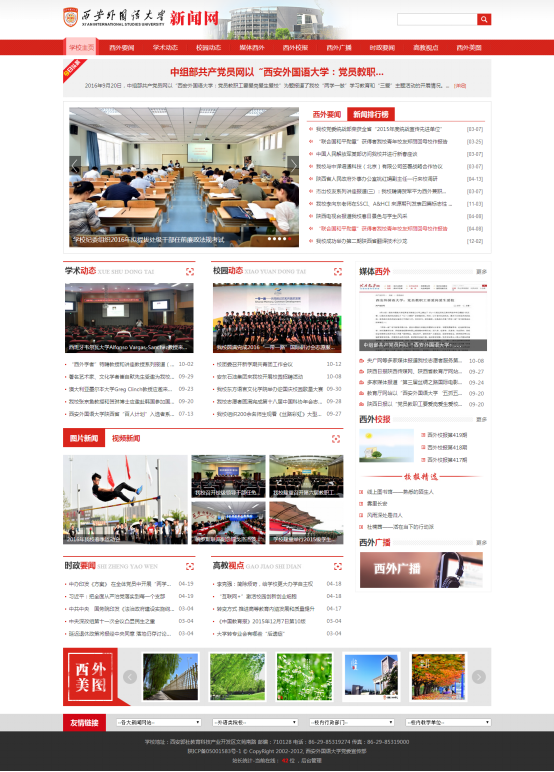 新版新闻网通过“今日头条”、“西外要闻”“学术动态”、“校园动态”全方位、多角度展现西外校风校貌、报道学校大小事;整合校内外媒体,报纸、广播、媒体摘要多媒介传播西外声音;采用图片、新闻、视频、图文多种信息呈现方式诉说西外故事。