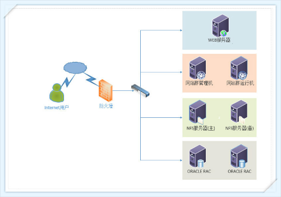 数据库服务器区域:采用基于Oracle的数据库双机热备方案,使用2台数据库服务器,其中1台为主服务器,1台为备机,使用1台存储服务器提供文件存储父服务。至于数据库为什么要采用热备,针对网站群应用而言,数据的安全性和数据库的可用性需求远高于提高数据库的性能,采用双机热备,可以提高数据库服务器的可用性以及数据安全性。