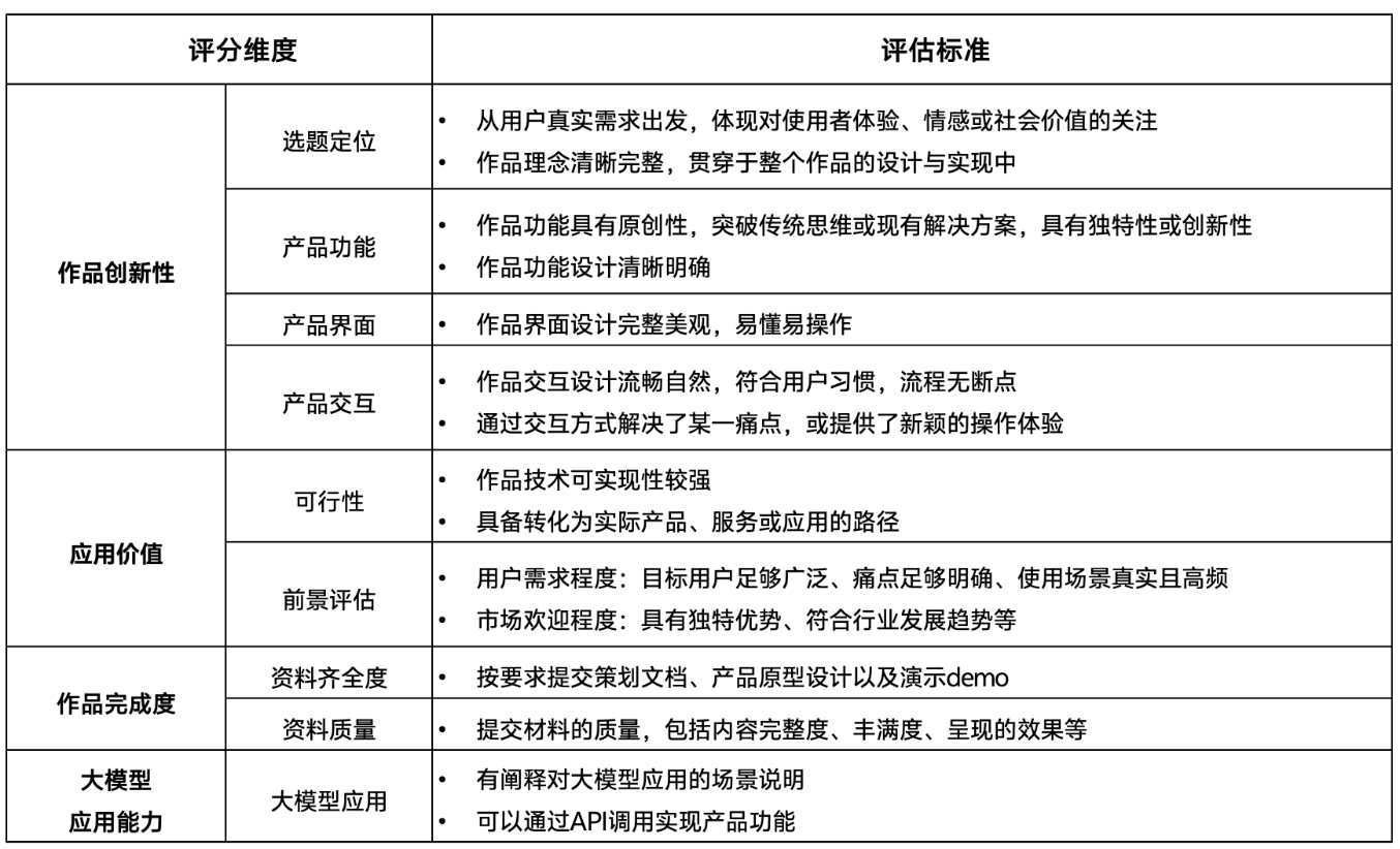 创作赛道一二三等奖的评审规则分为创新表现、AI设计深度、Prompt掌控力、作品完成度与表达四个维度,占比分别为30%、30%、30%、10%。
