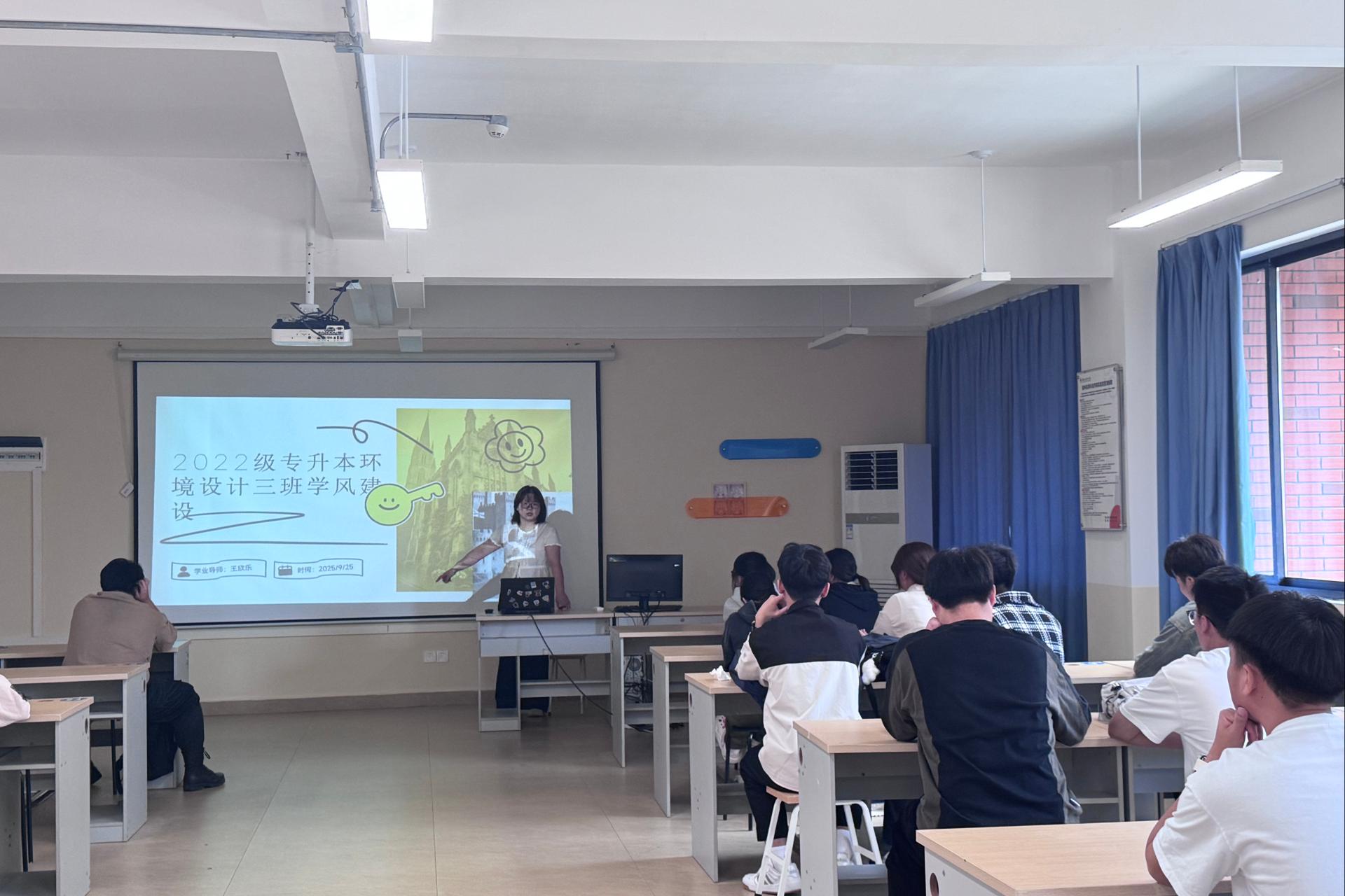 为进一步加强班级学风建设,积极迎接即将到来的本科教学合格评估工作,营造积极向上、严谨求实的学习氛围,创意设计学院2022级环境设计专升本3班于9月25日在守正楼G314教室召开主题班会。本次班会由学业导师王欣乐老师主持,全体同学积极参与。