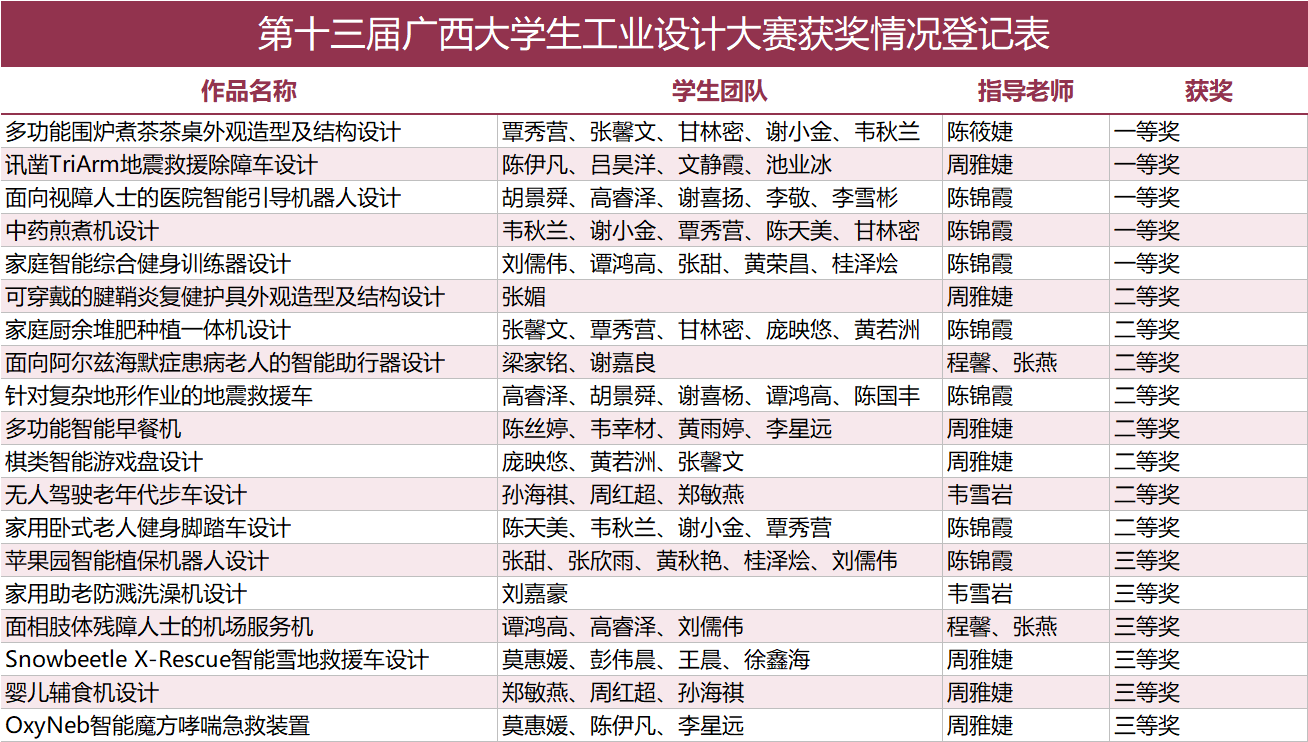 近日,由自治区教育厅主办、桂林电子科技大学承办的第十三届广西大学生工业设计大赛获奖名单正式揭晓。我校工业设计专业学子凭借扎实的专业功底与卓越的创新能力脱颖而出,一举荣获19项自治区级奖项,其中一等奖5项、二等奖7项、三等奖7项,获奖数量与质量均位居全区同类院校前列。与此同时,陈锦霞、周雅婕、陈筱婕三位教师因指导成效突出,荣获“优秀指导教师奖”,彰显了学校在设计类人才培养领域的坚实实力。