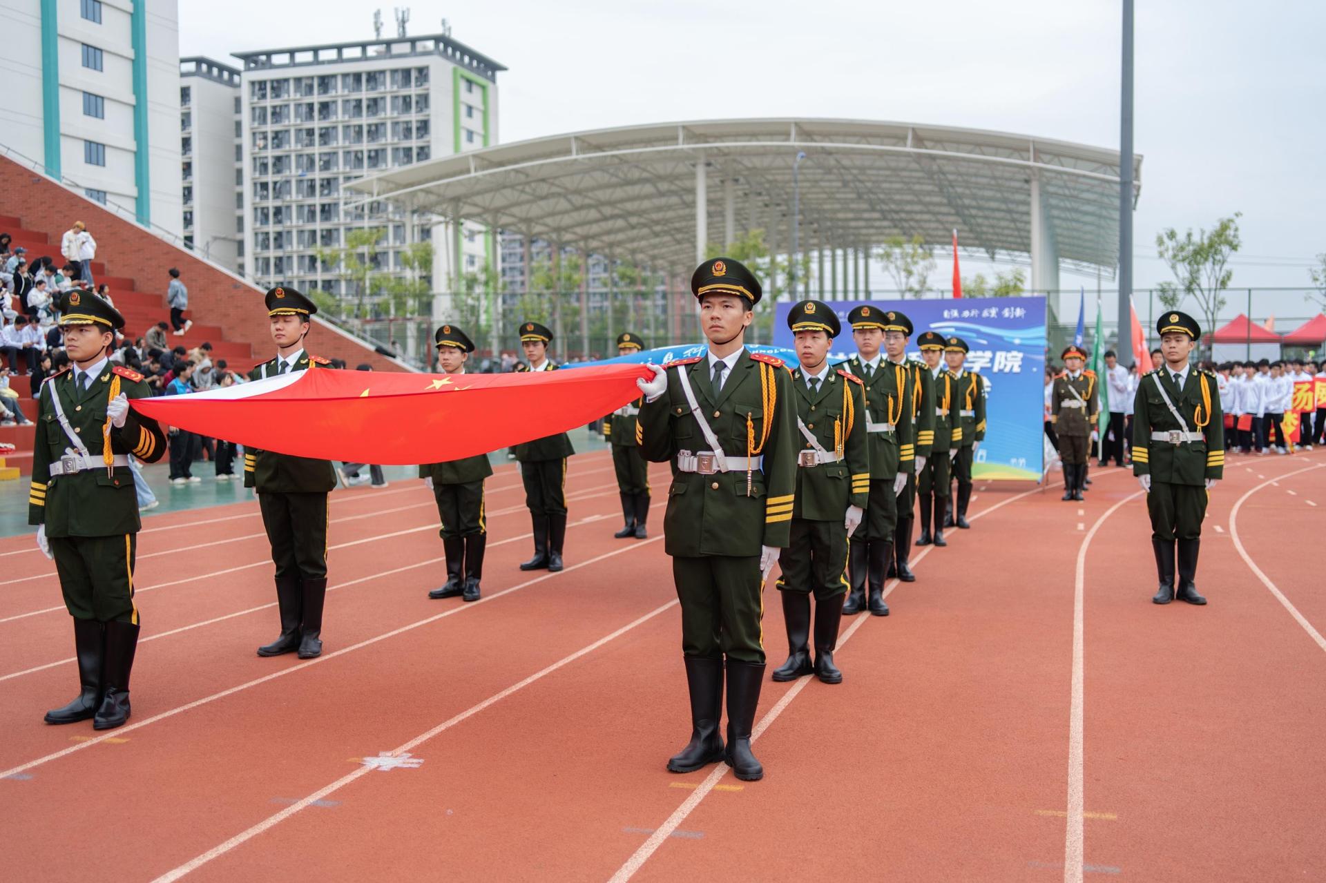随后,国旗护卫队、信息工程学院、电子工程学院等师生代表方队依次登场,意气风发地走过主席台接受检阅,充分展现了学校各学科专业特色与师生们的良好的精神风貌。