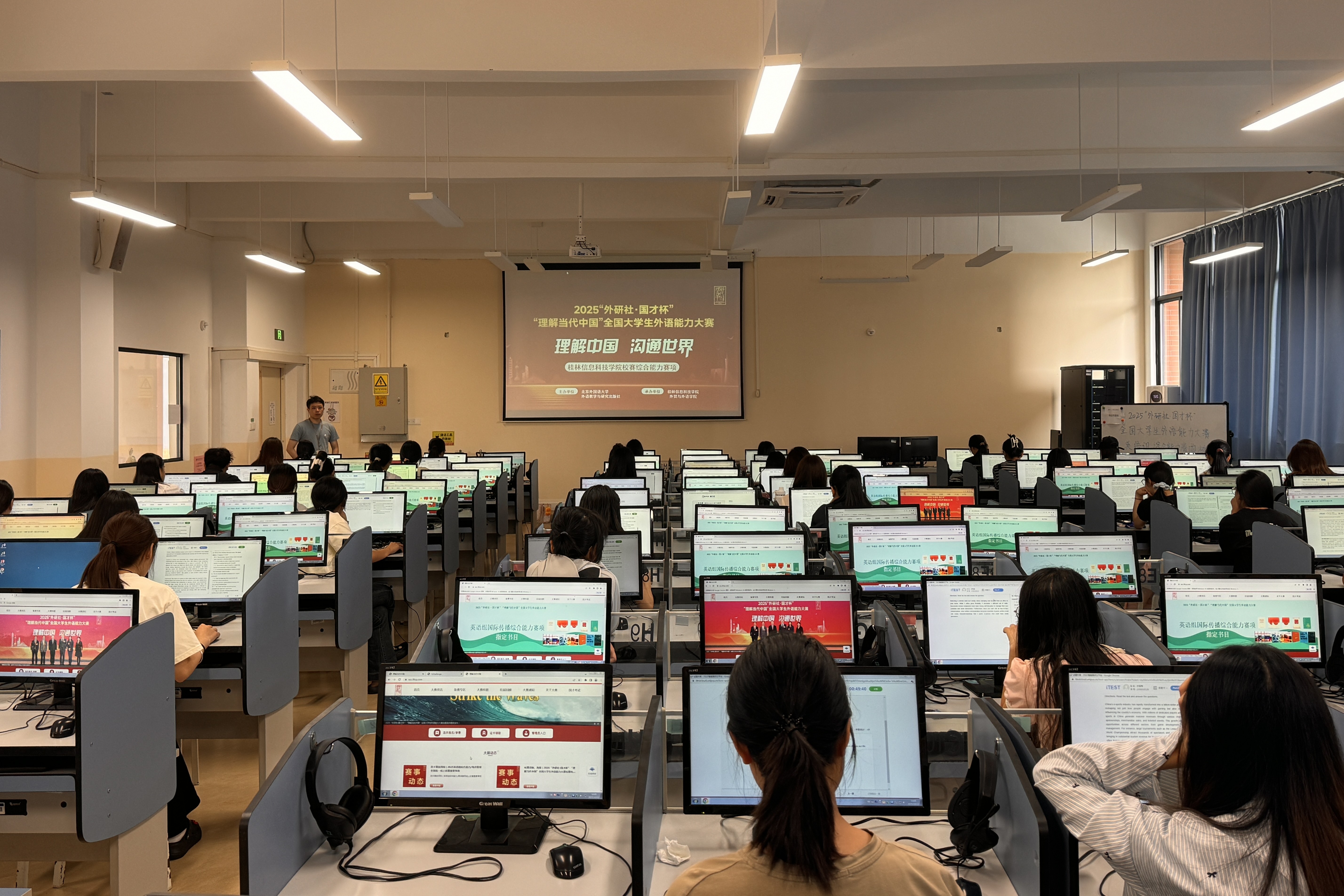 10月12日上午,外贸与外语学院组织我校55名参赛学生在博文楼F101参加2025年“外研社・国才杯”“理解当代中国”全国大学生外语能力大赛英语组综合能力赛项的线上校级初赛。此次比赛旨在引导当代大学生理解当代中国,提高学生的语言实践能力与综合素养,提升学生的国际传播能力。