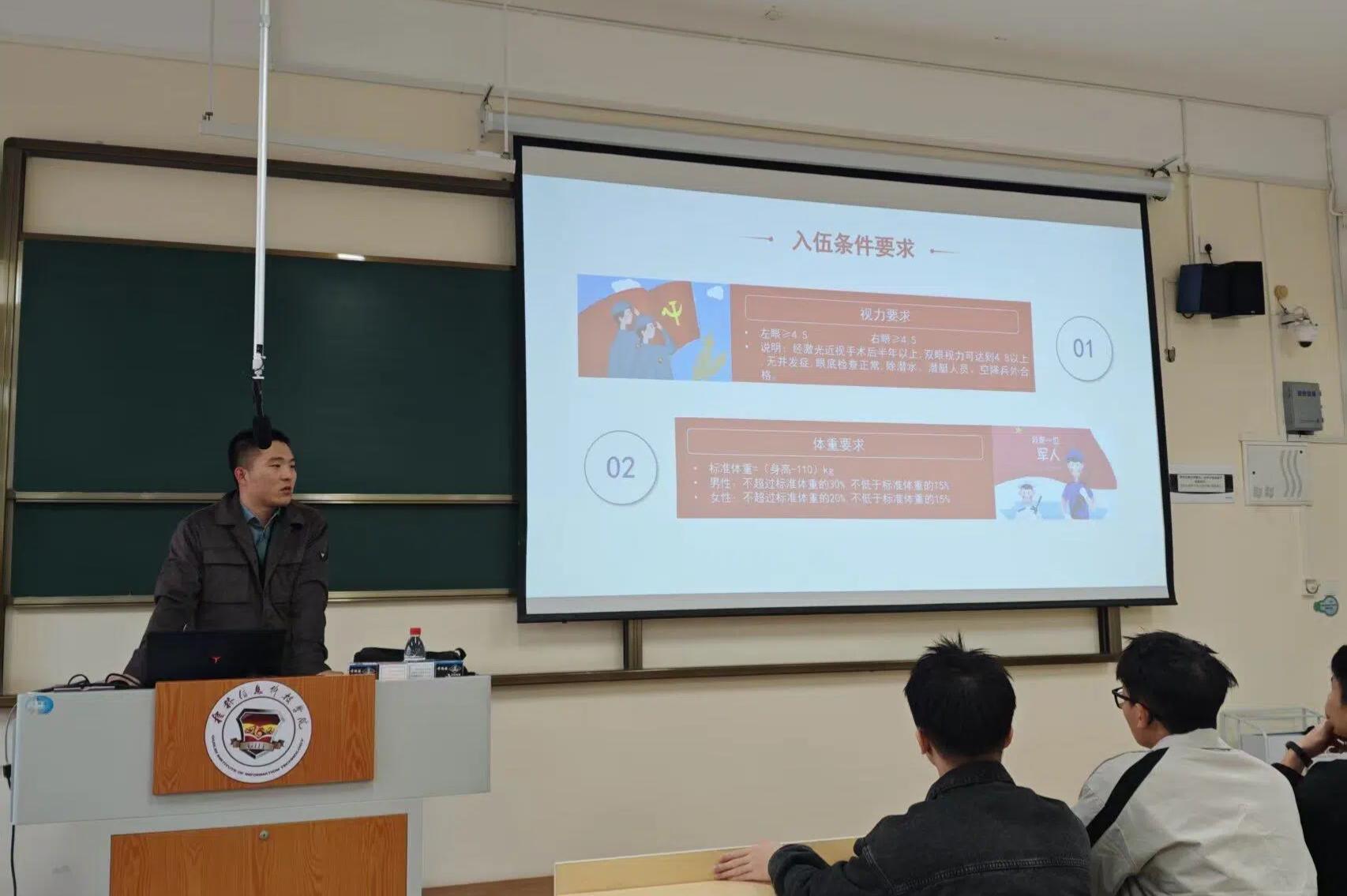会上,彭尧老师详细解读了2026年征兵政策,包括了征兵的时间安排、征集对象、报名条件、体检标准等核心政策。针对学生关心的学费补偿、升学优惠、就业扶持等优抚政策,彭老师结合具体案例进行了细致说明,让同学们清晰了解参军带来的多重保障与发展机遇。现场还设置了互动答疑环节,彭尧老师对同学们提出的入伍流程、岗位选择、军营适应等问题逐一解答,消除了大家的后顾之忧。此次动员会氛围热烈,有效激发了同学们的参军热情。22级韦浩捷表示,将认真考量自身情况,积极响应国家号召,以实际行动投身国防建设,在军营中实现人生价值。