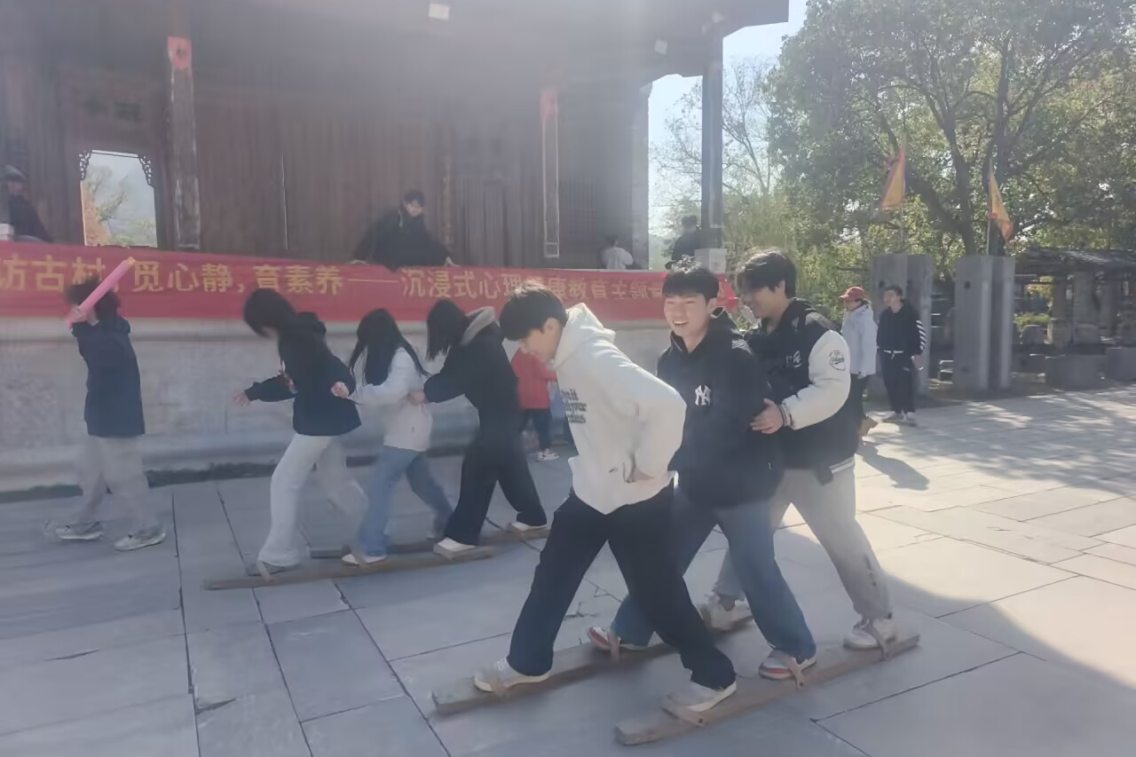 活动现场,青砖黛瓦的古建筑与灵秀山水相互映衬,为心理调适营造了静谧雅致的天然氛围。“珠行万里”考验团队成员的耐心细致与精准配合,“一圈到底”传递同伴间的信任与默契,“协力竞走”凝聚集体的节奏与向心力,这三项层层递进的团队挑战,将心理疏导融入真实协作情境。同学们全心投入其中,在挥洒汗水、收获欢笑的过程中释放学业压力,增进沟通理解,团队凝聚力与协作能力也在实践任务中得到有效淬炼与升华。