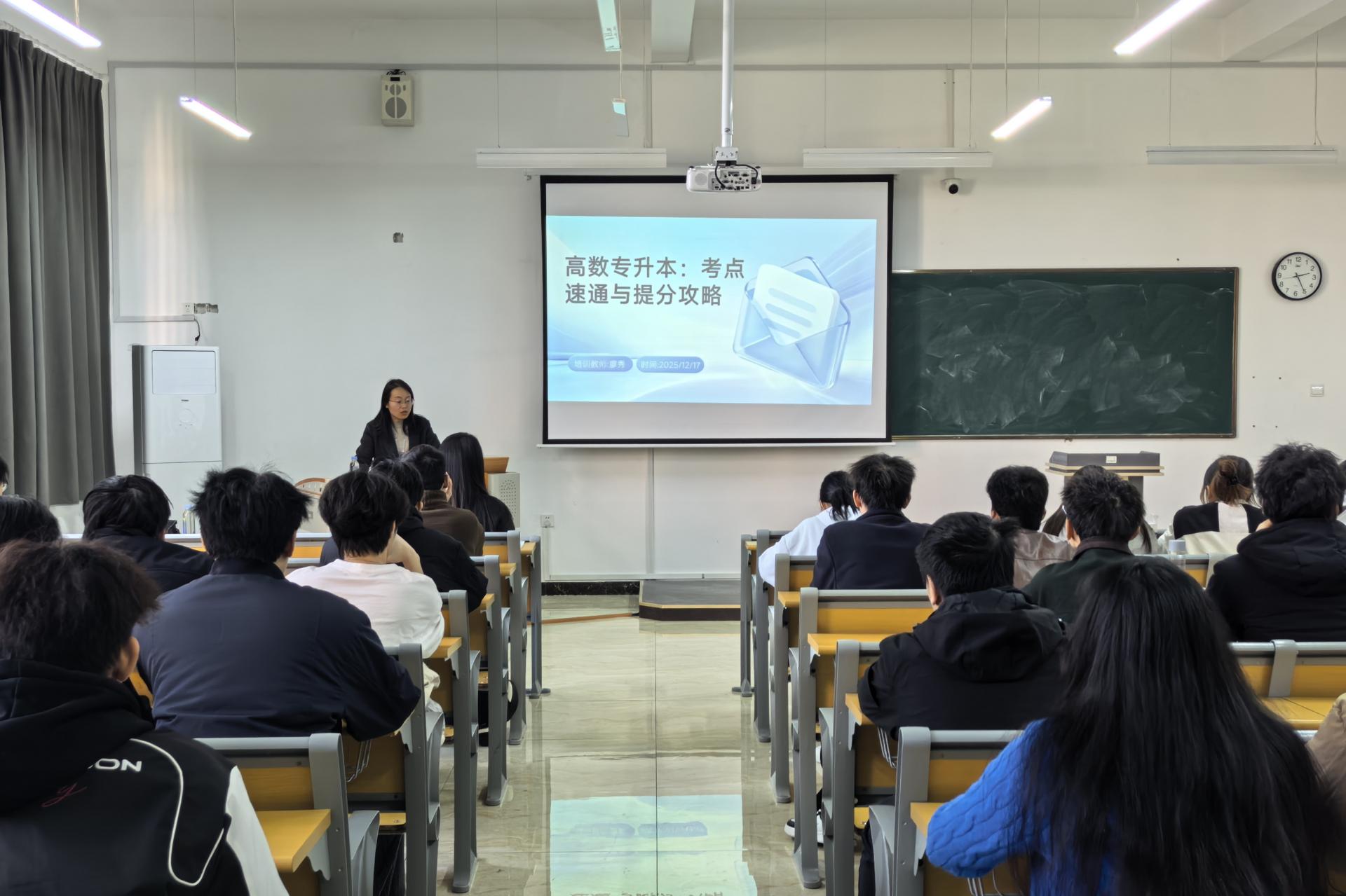 为切实助力桂林信息工程职业学院2023级有专升本意向的学子明晰考试形势、筑牢知识根基、科学规划备考路径。12月17日下午,我校主动发挥教学资源优势,委派工科数学教研室主任廖秀、英语(对外汉语)教研室专任教师覃耀葵专程赴桂林信息工程职业学院开展专升本考试高数与英语辅导专题讲座。此次讲座共40余名学生报名参加,现场学习交流氛围热烈浓厚。
