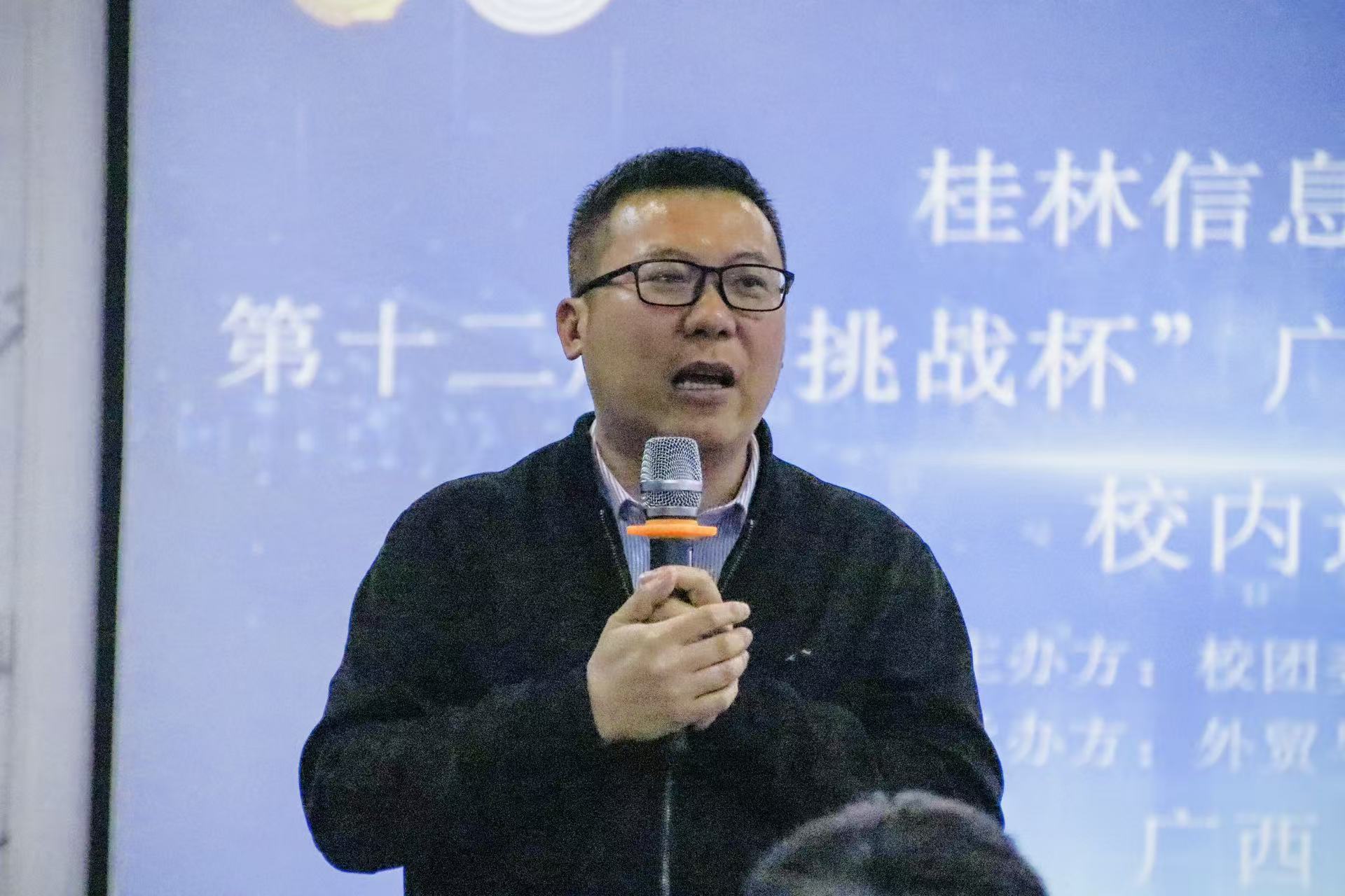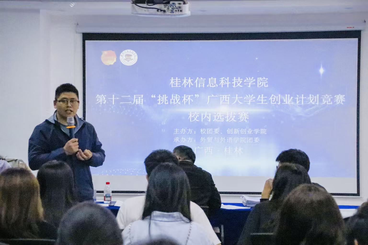 4月8日下午,我校第十二届“挑战杯”广西大学生创业计划竞赛校内选拔赛在学校创新创业学院1楼综合大厅顺利举行。本次比赛由校团委、学校创新创业学院主办,外贸与外语学院团委承办,经过前期的网络评审,最终选出了15支优秀队伍参加线下路演。桂林医科大学宣传部副部长金罗成老师、学校党委教师工作部部长周文彬老师、学校团委书记周阳霖老师、学校创新创业学院副院长黄鹏老师、学校学生发展与服务中心副主任肖玲老师担任本次比赛的现场评委。