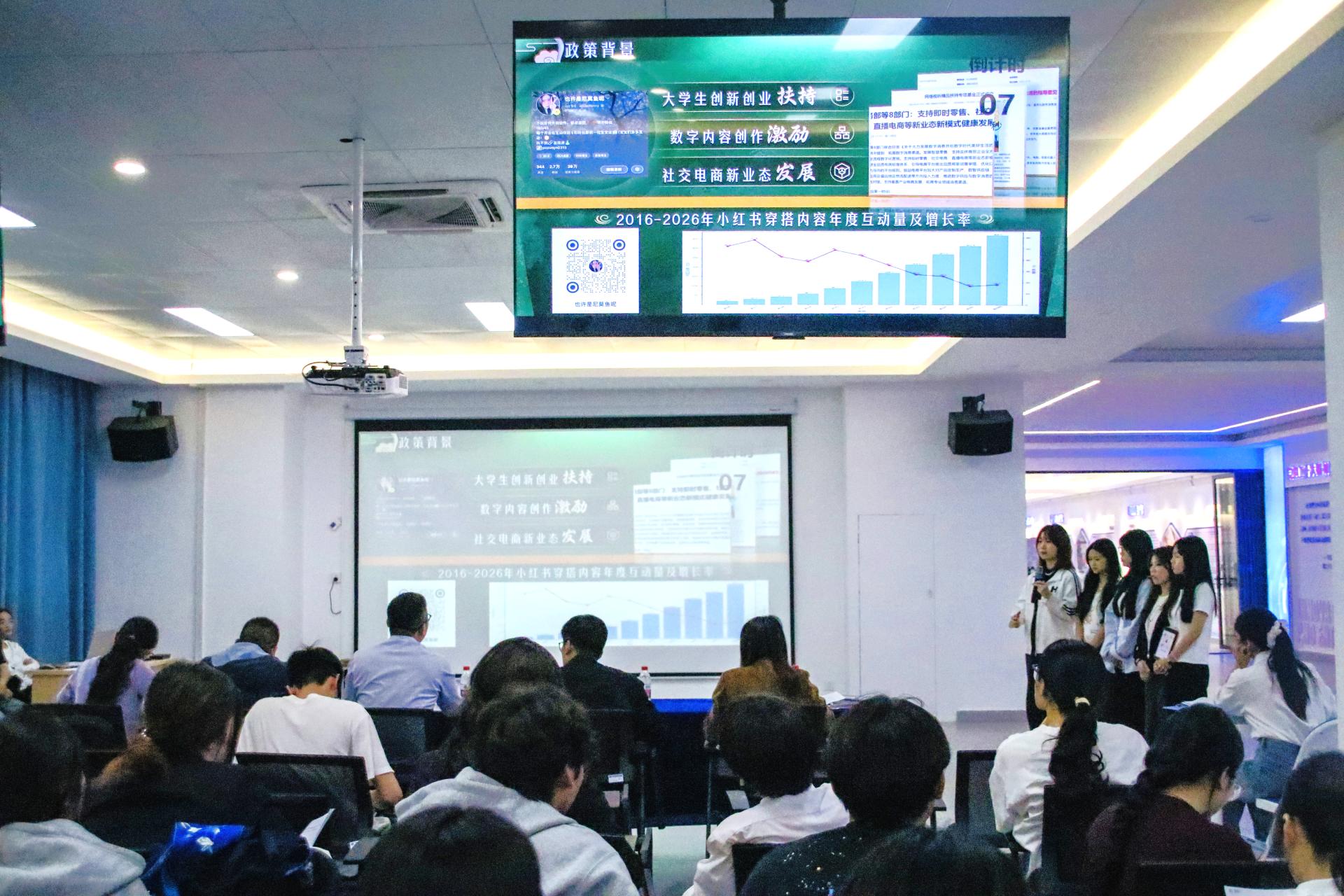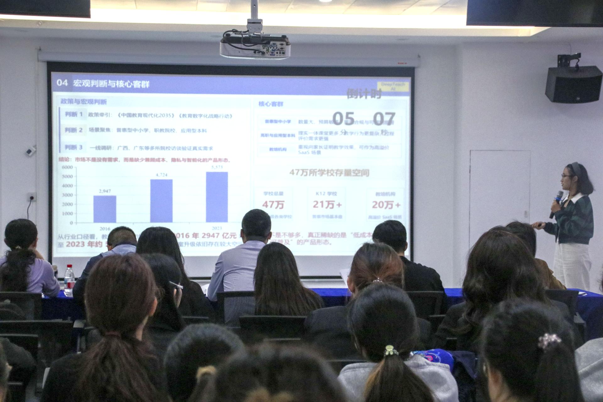 比赛开始后,各参赛队伍按照抽签顺序依次上台展示。每支队伍都拥有6分钟的精彩展示时间,他们精心准备,通过生动的PPT演示、精彩的视频播放以及激情洋溢的讲解,详细阐述项目的创新理念、市场前景、商业模式等核心内容,充分展现了我校学子在学术科技和创新创业领域的深厚积累与无限潜力。