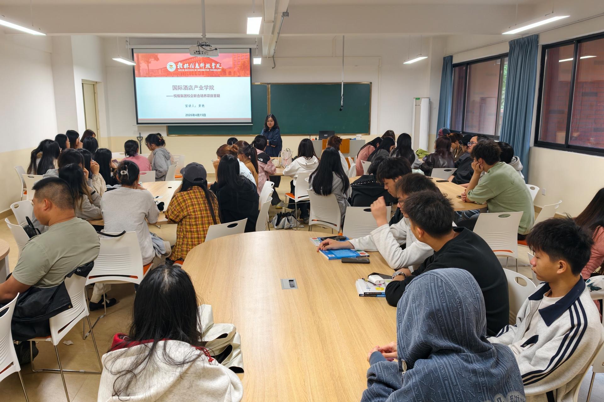 随后,黄艳老师立足学生核心关切,围绕酒店运营岗位与职能岗位两大类别展开详细解读。在运营岗位方面,她结合悦榕集团旗下各酒店的经营特色,对前厅接待、客房服务、餐饮管理等岗位的日常业务流程、服务标准及职业能力要求进行了细致拆解;在职能岗位方面,系统梳理了人力资源、市场营销、财务管理等岗位的任职条件与成长路径。她特别强调,订制班人才培养始终紧扣“服务意识、专业能力、英语应用、跨文化素养”四位一体的复合型目标,确保人才供给与酒店行业高质量发展需求同频共振。