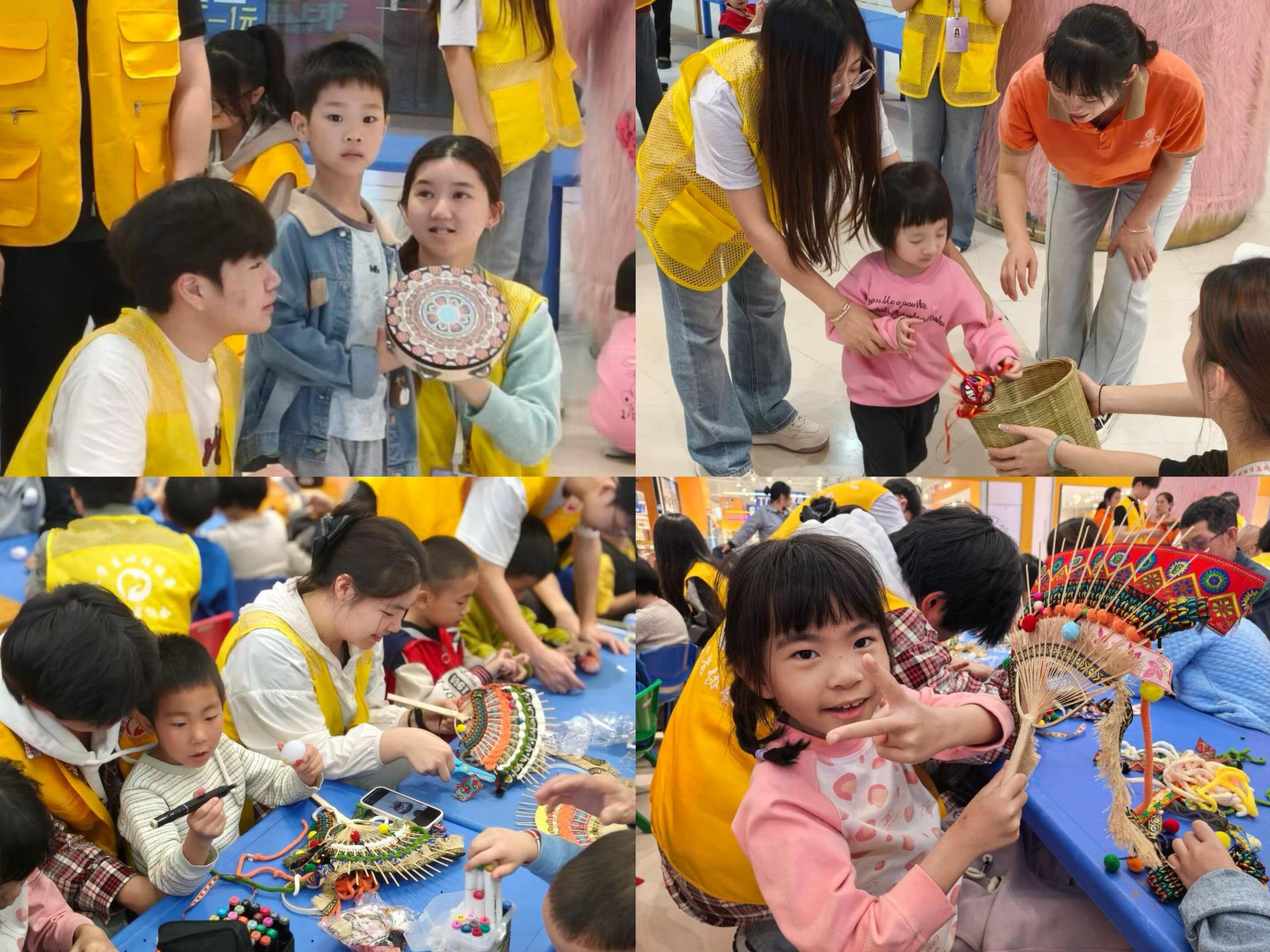壮锦是中国四大名锦之一,壮族织锦技艺于2006年列入国家首批非物质文化遗产代表性项目名录,其“经纬交织、坚韧传承”的文化内涵,是壮乡文化的鲜活载体。在手工创作环节,孩子们以壮锦经典的菱形、回形等纹样为灵感,在空白扇面上自由创作。志愿者同步协助孩子们进行制作,让孩子们在动手实践中感受非遗之美,让千年技艺在童趣创作中生根发芽。