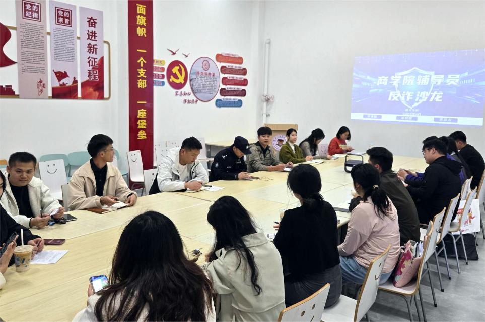 4月23日,商学院学工办在崇德楼社区党员活动室开展反诈专题沙龙暨辅导员职业成长之“薪火计划”(第十一期)。学院党委副书记梁梦良,临桂庙岭派出所秦警官、保卫处主管王翀及全体辅导员参会,共同围绕校园反诈工作展开深入交流。