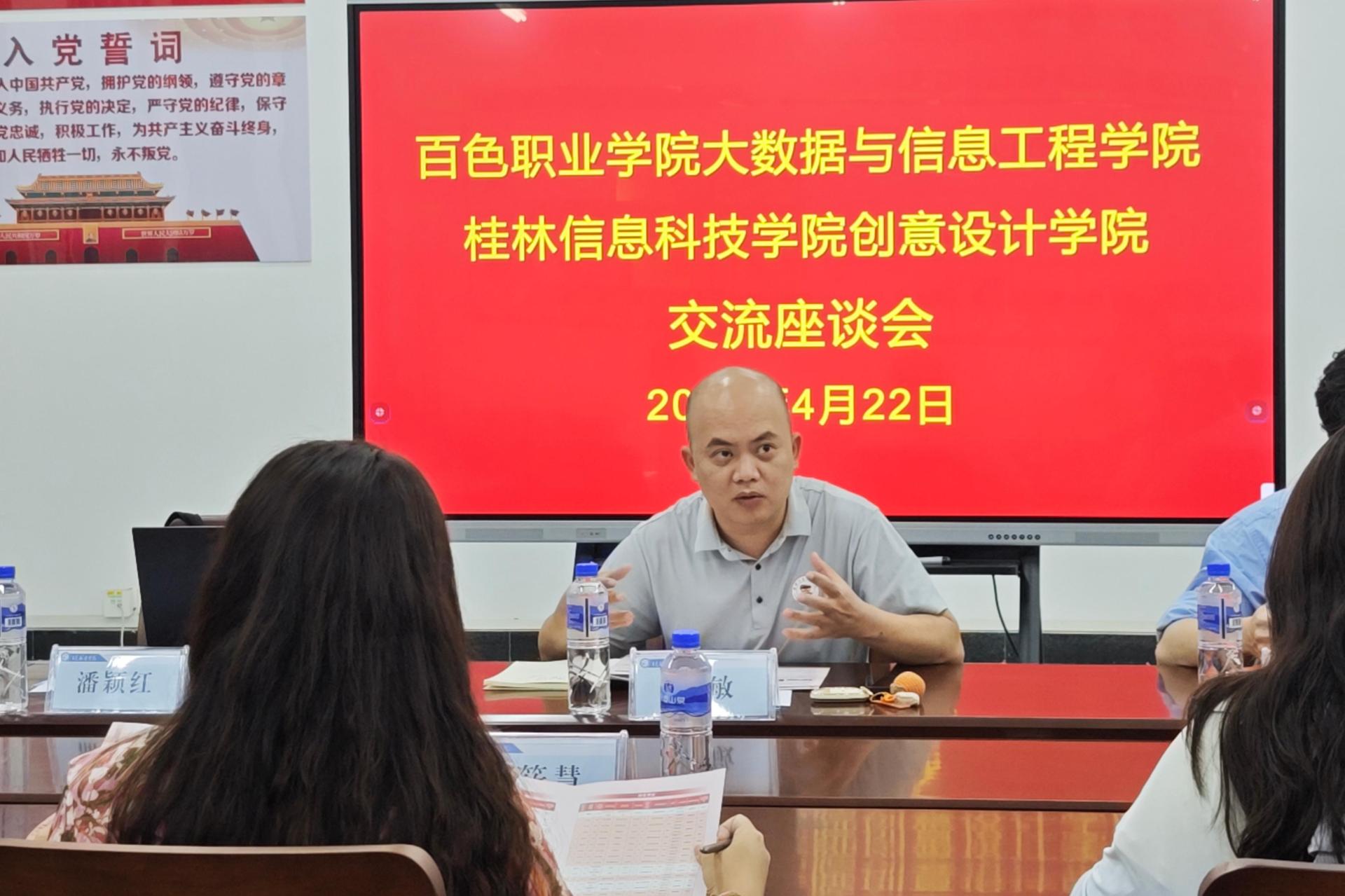 为深化校际协同育人合作,搭建人才培养衔接桥梁,近日,创意设计学院环境设计教研室主任蒙敏带领专任教师林泽楷、潘影红一行三人,赴百色开展专升本招生宣传与交流对接活动。团队与百色职业学院大数据与信息工程学院院长杨筱慧进行座谈交流,助力专科学子圆梦本科。