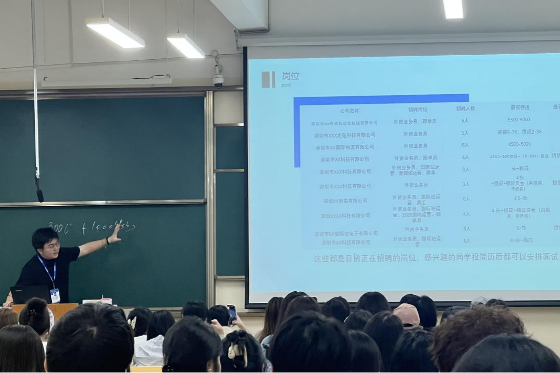 讲座开场,黄佳乐经理便用一连串详细的数据,勾勒出大湾区跨境电商To C板块强劲的增长态势。他指出,随着全球消费线上化加速,家居、服饰、3C电子等品类通过独立站、第三方平台及全托管模式持续出海,社交电商与直播带货异军突起,正重塑着零售出口的生态。与此同时,企业对人才的要求也在迅速升级:单纯的店铺运营已难以满足发展需求,市场急需能够驾驭数据分析、用户洞察、内容创作与品牌策划的复合型人才。黄佳乐通过多个企业招聘实例,详细拆解了外贸业务员、跨境电商运营、海外社媒推广、新媒体运营等核心岗位的日常工作流程,让同学们直观感受到“懂选品、会分析、能策划、善沟通”已成为To C赛道抢手人才的基本画像。他特别提醒,面对算法与模式不断迭代的行业常态,平时在课堂上学到的理论,必须与一线实操反复结合,才能形成真正的职场竞争力。围绕人才职业规划,黄佳乐从企业用人视角出发,为同学们梳理出一条清晰的成长路径。他建议大家先通过行业调研和岗位分析找准自身定位,再围绕简历撰写、面试准备等环节进行有针对性的能力包装与提升,并着重强调要尽早走进企业,在选品、运营、客户沟通等实际业务中积累经验,通过真场景历练为未来职业发展打下扎实基础。互动交流环节,同学们提问踊跃,黄佳乐经理逐一细致解答。