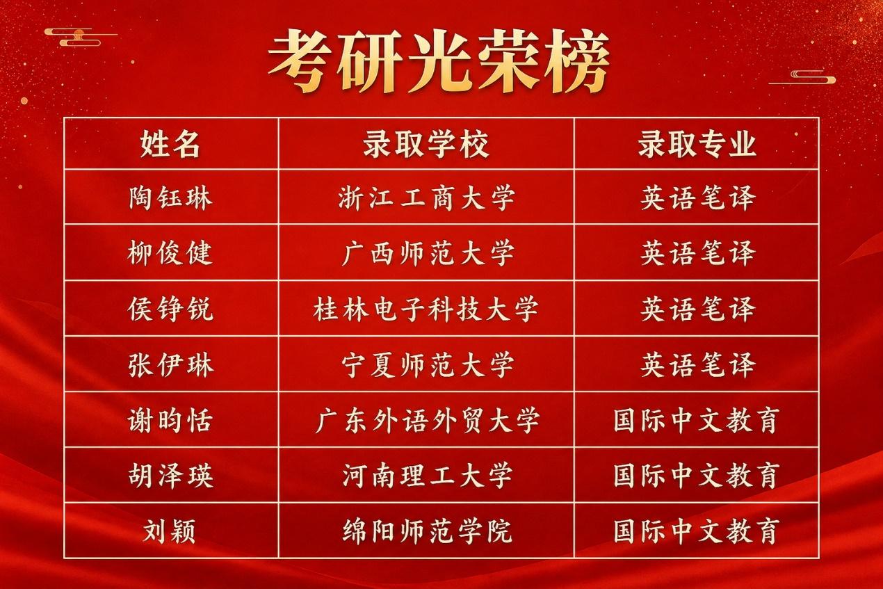 近日,2026年全国硕士研究生招生考试录取结果陆续公布,外贸与外语学院英语专业考研捷报频传,共有7名2022级学生顺利上岸,分别被广西师范大学、桂林电子科技大学等高校录取,专业方向涵盖英语笔译和国际中文教育,充分彰显了学院人才培养的显著成效。