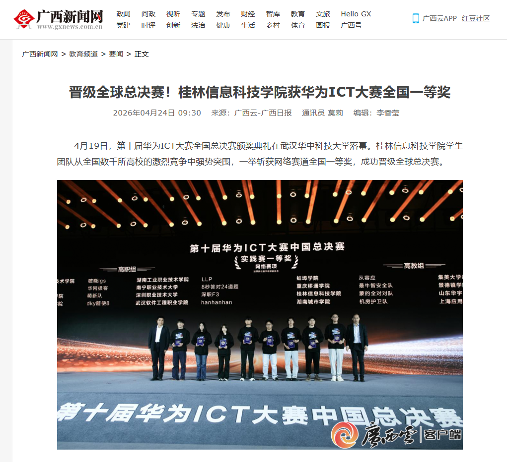 广西新闻网:晋级全球总决赛!桂林信息科技学院获华为ICT大赛全国一等奖
