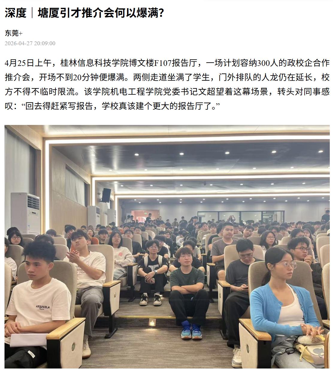 4月25日上午,桂林信息科技学院博文楼F107报告厅,一场计划容纳300人的政校企合作推介会,开场不到20分钟便爆满。两侧走道坐满了学生,门外排队的人龙仍在延长,校方不得不临时限流。该学院机电工程学院党委书记文超望着这幕场景,转头对同事感叹:“回去得赶紧写报告,学校真该建个更大的报告厅了。”