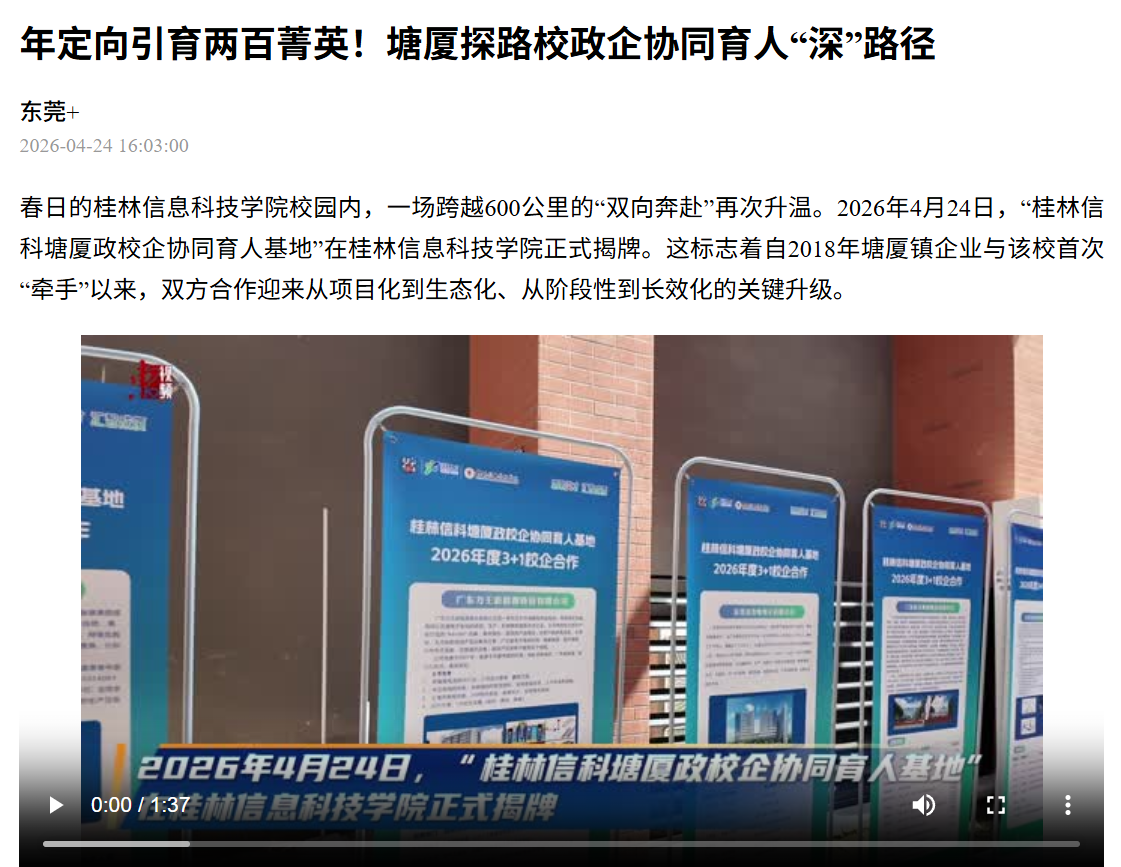 春日的桂林信息科技学院校园内,一场跨越600公里的“双向奔赴”再次升温。2026年4月24日,“桂林信科塘厦政校企协同育人基地”在桂林信息科技学院正式揭牌。这标志着自2018年塘厦镇企业与该校首次“牵手”以来,双方合作迎来从项目化到生态化、从阶段性到长效化的关键升级。
