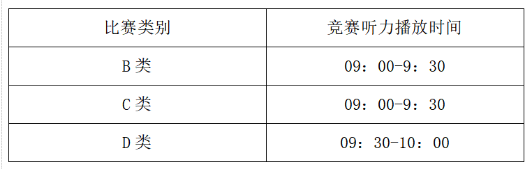 4.B类竞赛的听力音频由监考员在语音室内播放,C类、D类竞赛由学校多媒体教室广播系统统一播放,无需自带耳机和收音机。具体放音时间如下:
