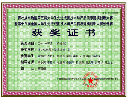 学生各类大赛和双创成果:近年来,本专业学生在全国大学生机械创新设计大赛、广西高校大学生工程能力竞赛等比赛中获得各级各类奖项30余项。近三年,本专业毕业生就业率保持在93%以上。学生竞赛参与率达30%,获全国机甲大赛一等奖等省级以上的奖项22项,完成国家级大创项目4项。