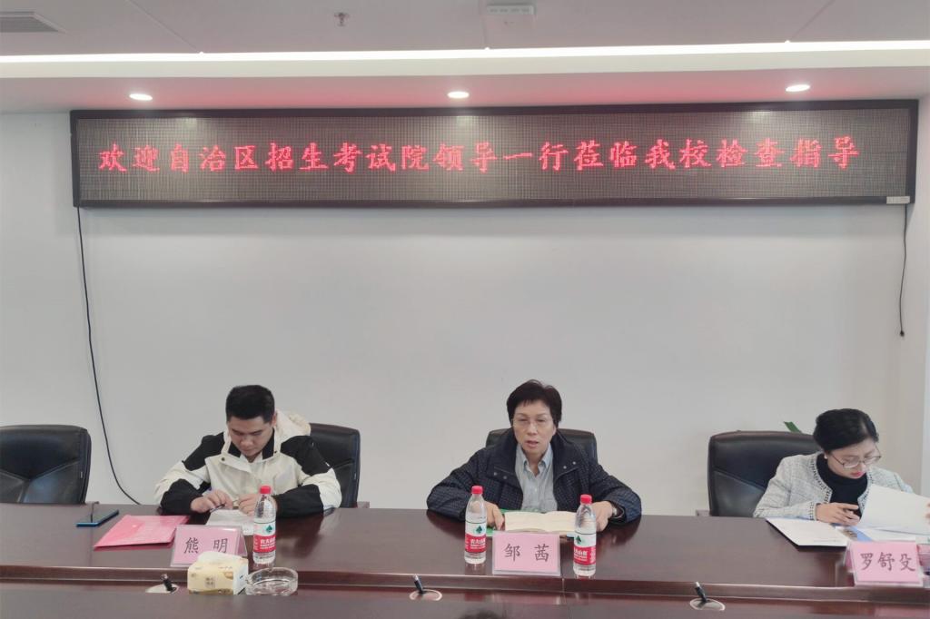 11月23日上午,自治区招生考试院邹莤调研员一行三人莅临我校对标准化考场建设进行了检查验收。学校副校长陈玲萍、信息中心主任何滔、教务科技处副处长全刘辉及相关人员参加了本次检查验收工作。