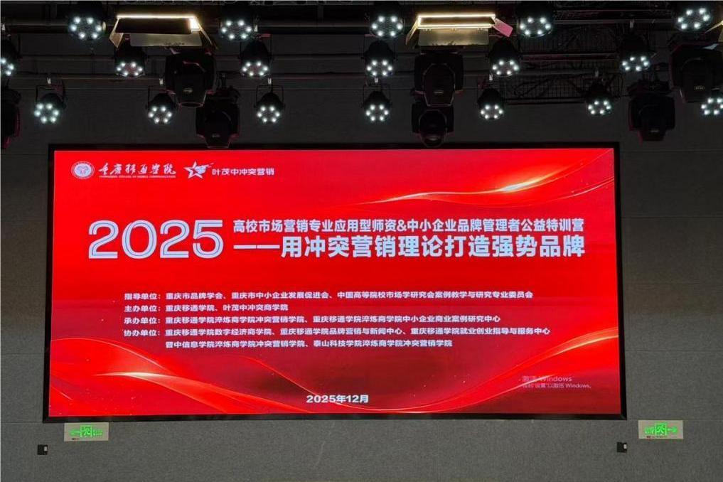 12月26日至27日,由重庆市品牌学会、重庆市中小企业发展促进会等单位指导,重庆移通学院与叶茂中冲突商学院联合主办的“高校市场营销应用型师资&中小企业品牌管理者公益特训营”在重庆移通学院举办。为深化产教融合、提升师资实战能力,我院罗志明副院长带领市场营销教研室冯超民老师、卢昌蓬老师一行,前往参与了本次培训。