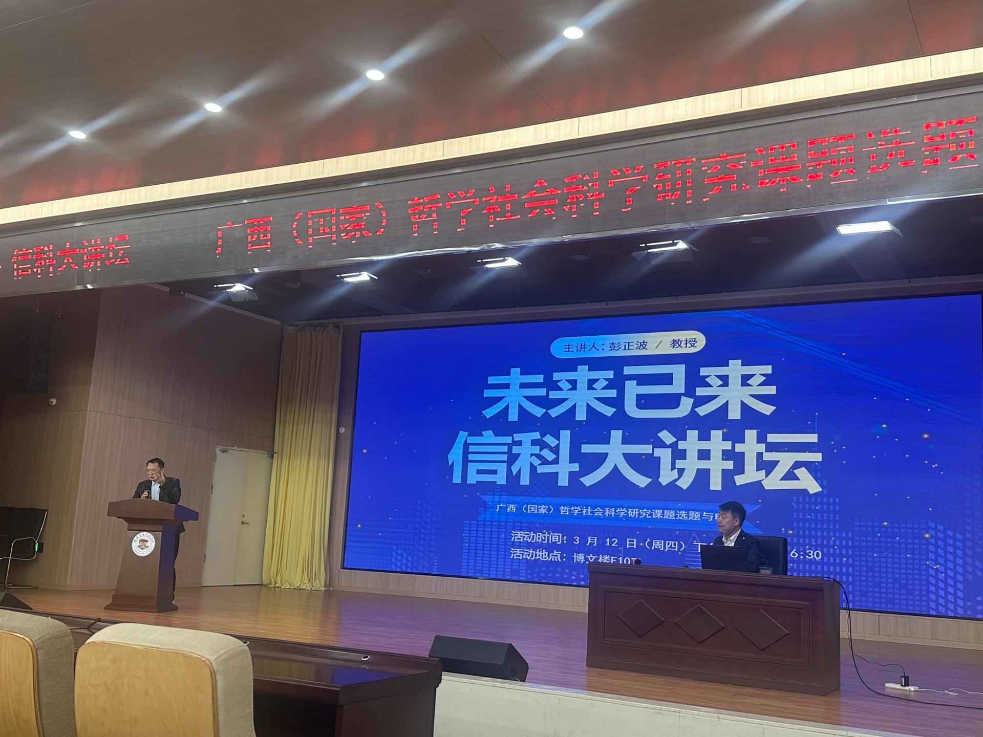 为精准破解我校教师在哲学社会科学课题申报中的困惑,助力教师找准选题方向、提升申报实操能力,3月12日下午14:30—16:30,由学校科技处主办的“未来已来・信科大讲坛”第二场专题讲座在博文楼F107学术报告厅圆满举行。本次讲座特邀桂林理工大学彭正波教授,围绕“广西(国家)哲学社会科学研究课题选题与申报”主题开展专题辅导,科技处处长杨国辉主持讲座,各教学单位、科研机构教师代表齐聚一堂,交流学习、共促提升。