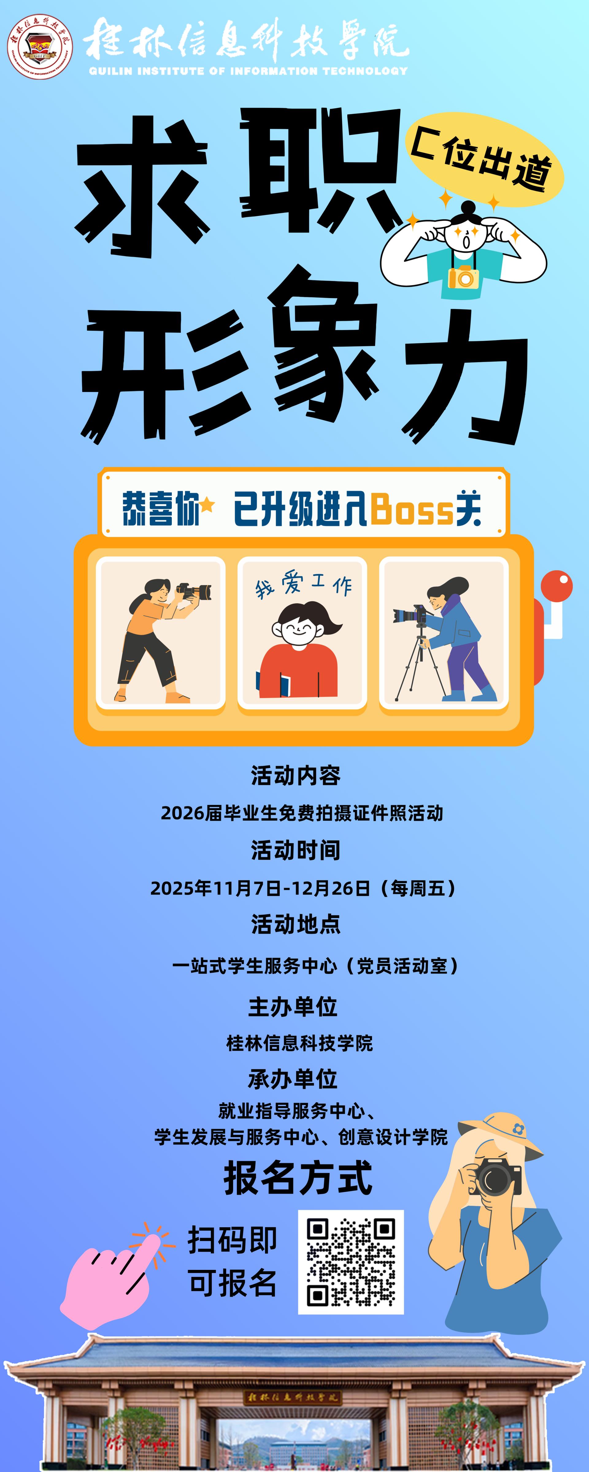 为切实做好2026届毕业生就业指导与服务工作,提升学生求职形象与职场竞争力,11月7日,我校正式启动“最美证件照”免费拍摄系列活动。活动以“C位出道,‘照’亮未来”为主题,通过专业、便捷的拍摄服务,为毕业生求职之路保驾护航。