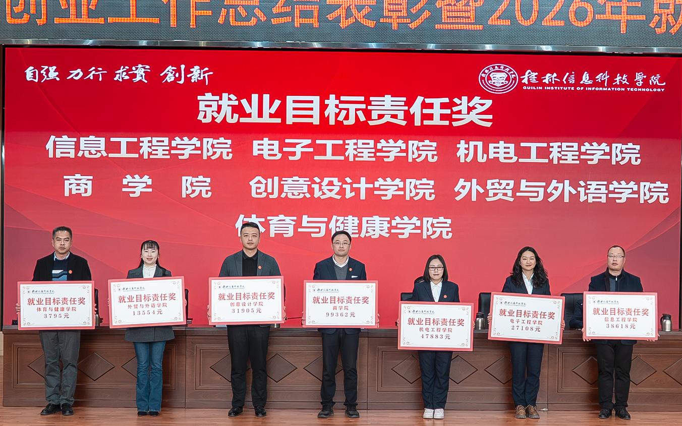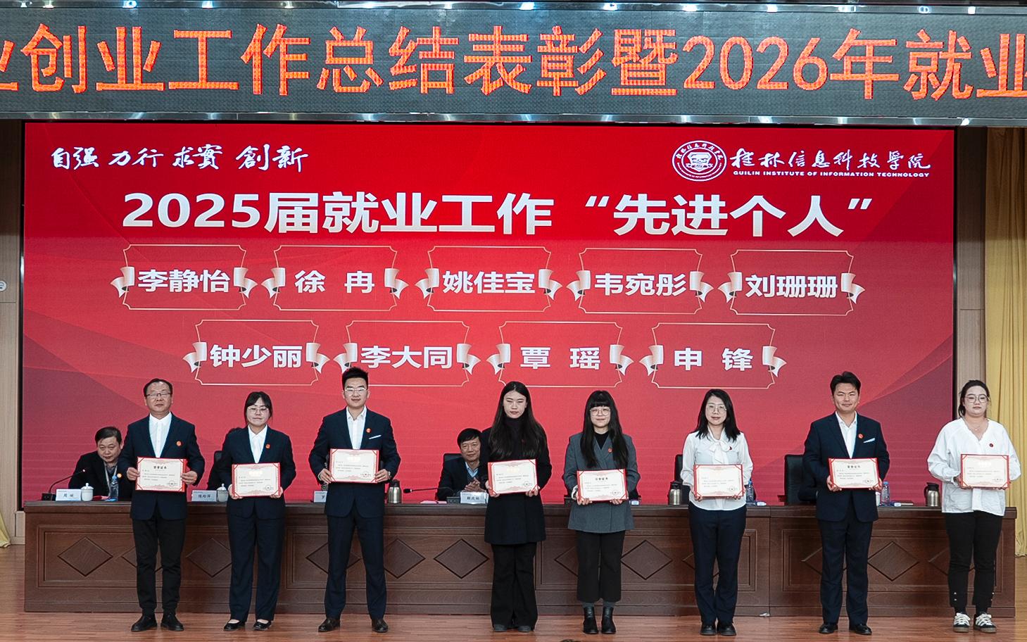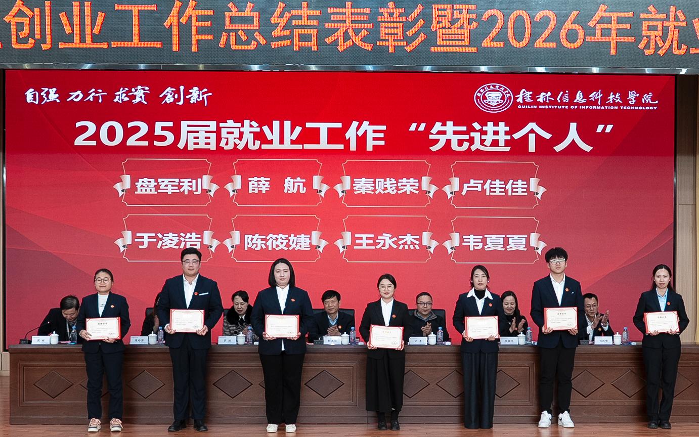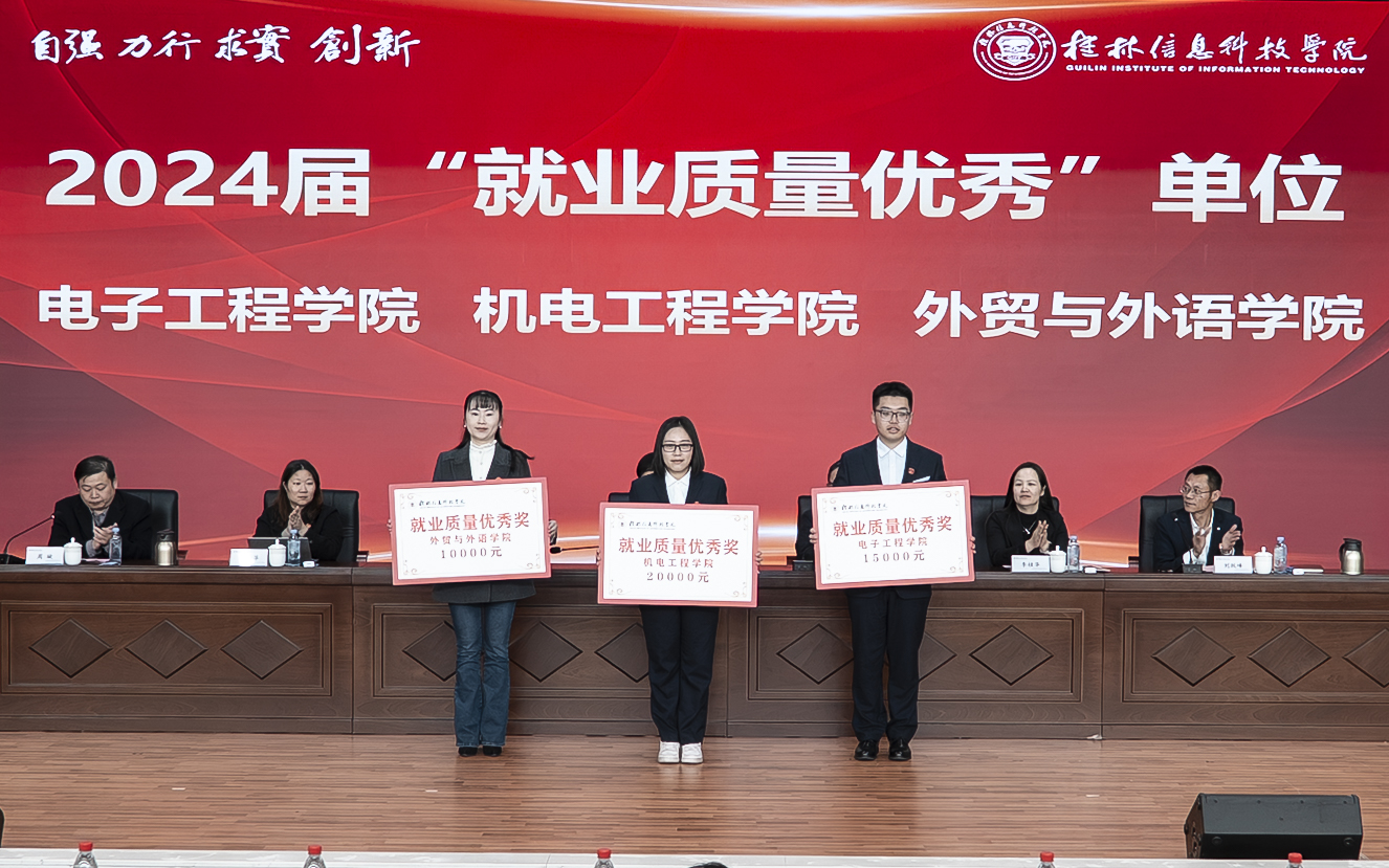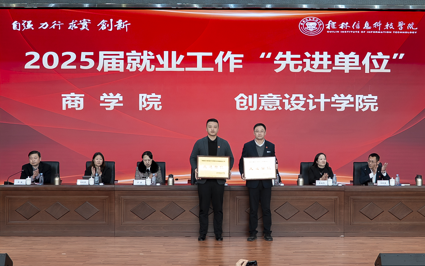 会上,党委书记甘勇宣读了2025届毕业生就业工作表彰决定。校领导为荣获“就业工作先进单位”“就业质量优秀奖”“就业目标责任奖”“留桂就业奖”的集体以及“就业先进个人”颁发了奖牌与证书。
