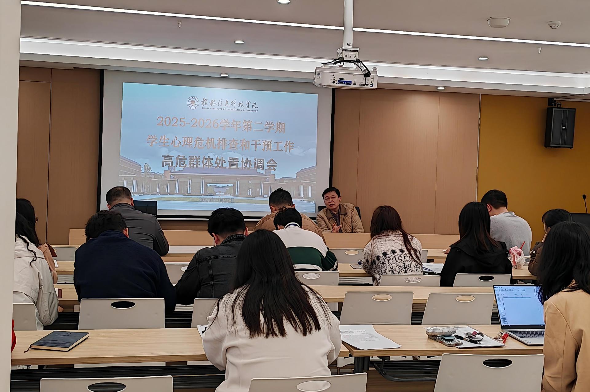 为精准做好春季学期学生心理危机预防与干预工作,近日,我校在学生发展与服务中心多功能厅召开2025-2026学年第二学期心理高危学生群体处置协调会议。校长助理、纪委书记周璇出席,党委学生工作部副部长蒋勇、心理中心专职教师,各二级学院相关负责人及辅导员参会,会议由心理中心主任张承宗主持。