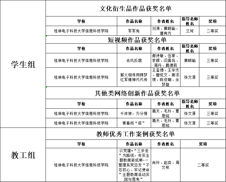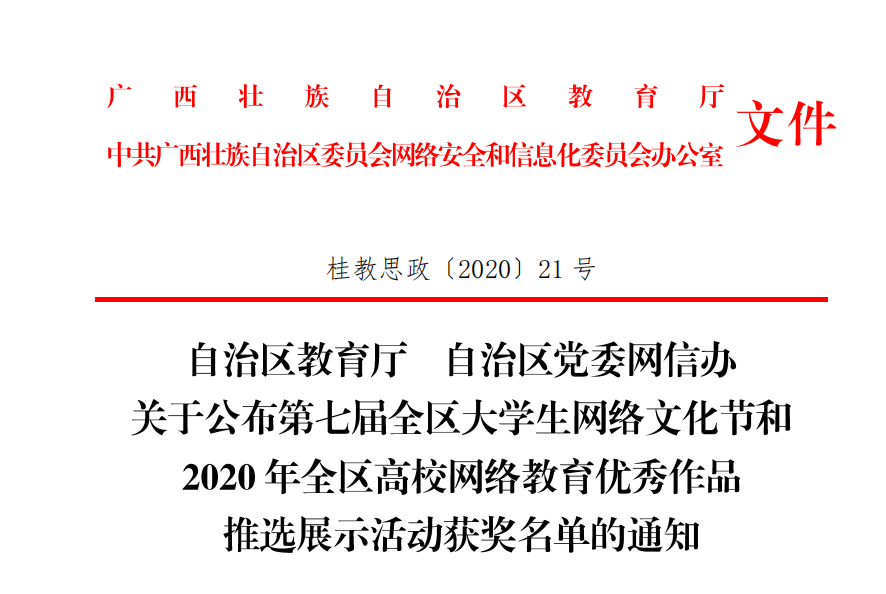 近日,自治区教育厅、自治区党委网信办下发《关于公布第七届全区大学生网络文化节和2020年全区高校网络教育优秀作品推选展示活动获奖名单的通知》(桂教思政〔2020〕21号),其中,我院学生组刘涛所创作的文化衍生作品《军军兔》在兰珂老师的指导下获得二等奖的好成绩,学生短视频作品《去风反腐》、《薪火相传同铸梦红军精神代代传》和微信推文作品《千床被、万分情》《青春战“疫”》均取得三等奖的好成绩,兰珂老师被评为优秀指导老师。教工组肖玲老师所编写的工作案例《以党建+“三步走”为路线,夯实主题教育新成果》被评为优秀工作案例二等奖。